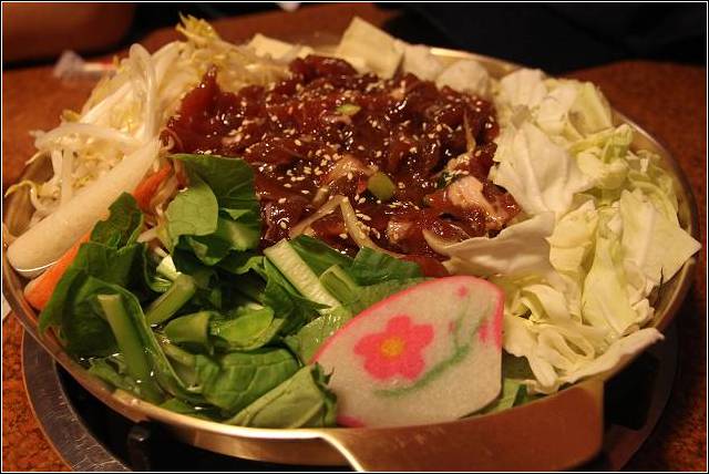 青菜份量還不少,肉在銅盤上滋滋響,一下子就把烤過的肉汁流進湯頭