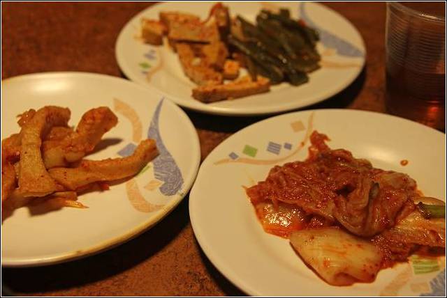 店家附贈的小菜三式,有泡菜、甜不辣、豆乾以及海帶,看起來挺陽春的,味道也沒什麼記憶點