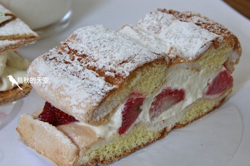 看得出那鬆軟綿密的黃白夾層,表皮微微酥脆,將卡士達奶油、新鮮草莓緊緊包裹,難怪人氣很高