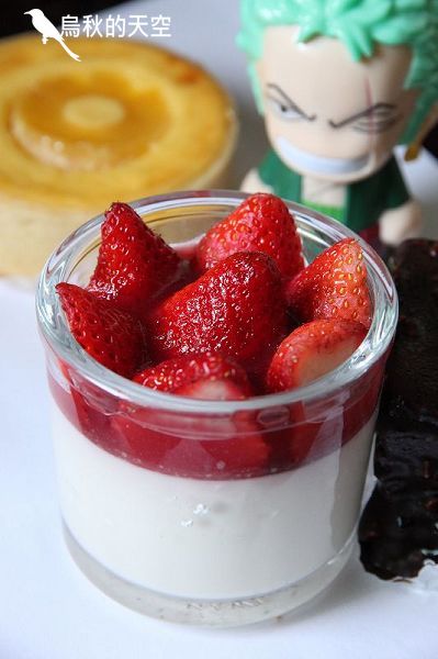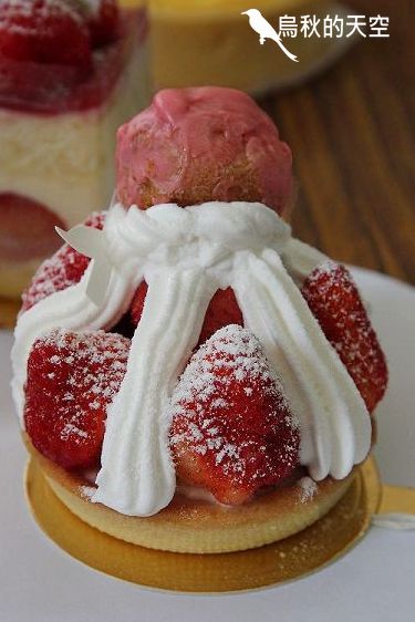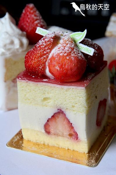 上頭是新鮮的大草莓灑上糖霜粉,中間是香草蛋糕搭上香草慕斯,有著奶凍的口感