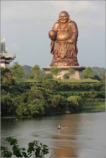 進入峨眉湖畔就會看到聳立在湖邊的彌勒佛,被四面的湖水團團圍住