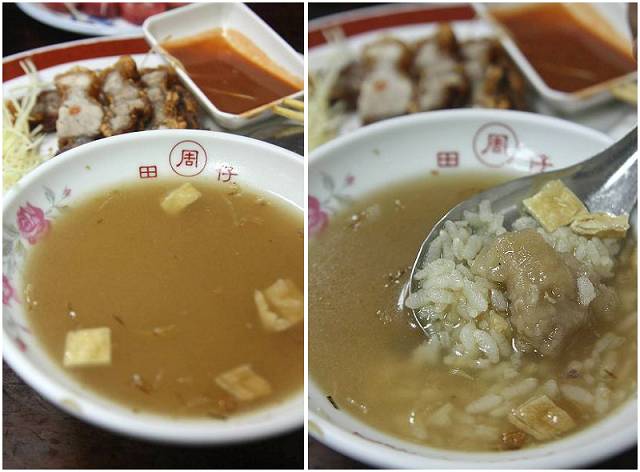 不過以生米、豆皮、蝦米及紅蔥頭熬成的深褐色湯頭,是其精華