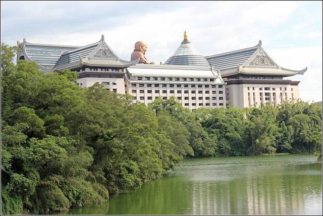 進入峨眉湖畔就會看到聳立在湖邊的彌勒佛,被四面的湖水團團圍住
